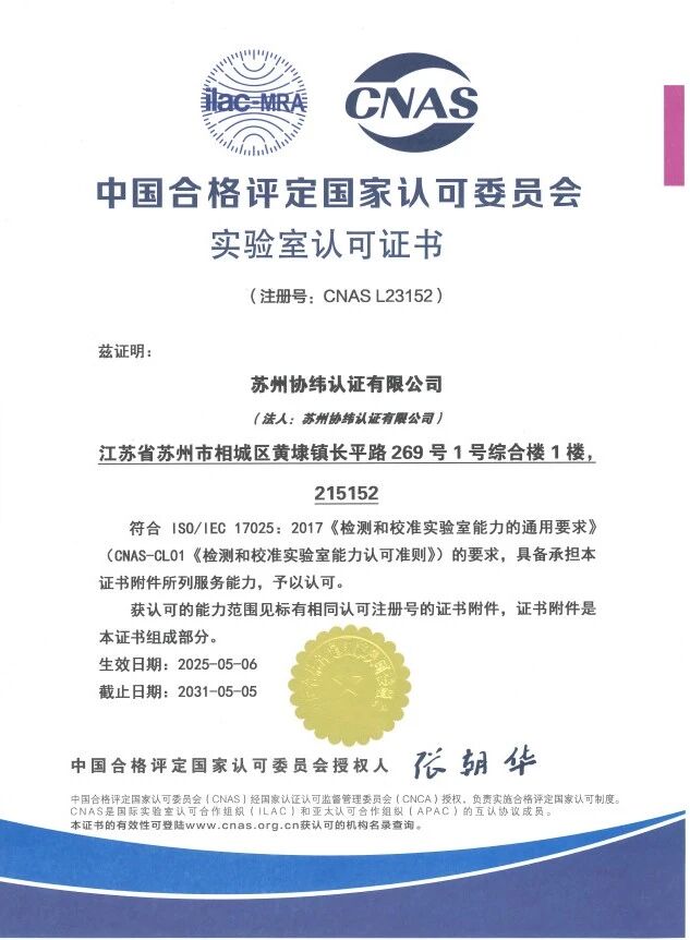 2025/05 协纬认证正式获得CNAS实验室认可资质
